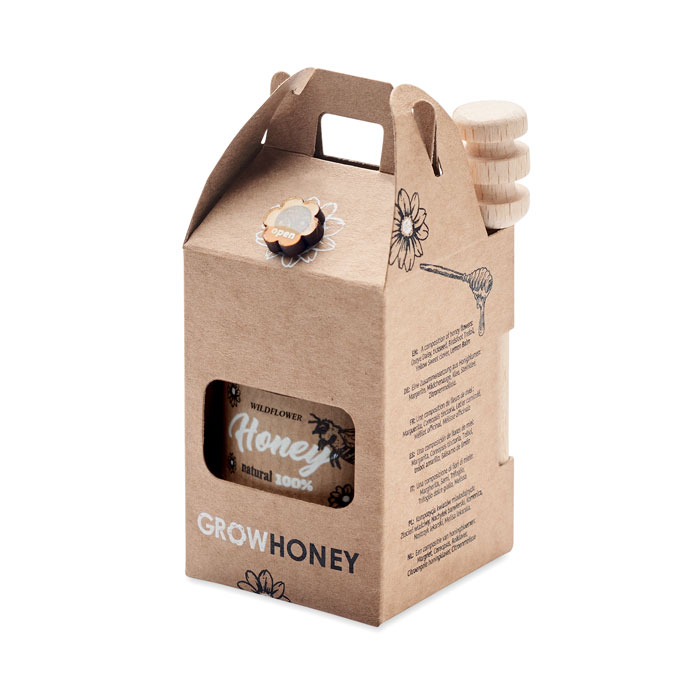 Tarro de miel de flores silvestres (50g) con dispensador de miel de madera. Viene en una caja de papel kraft. Incluye semillas de flores de abeja. Fabricado en la UE.