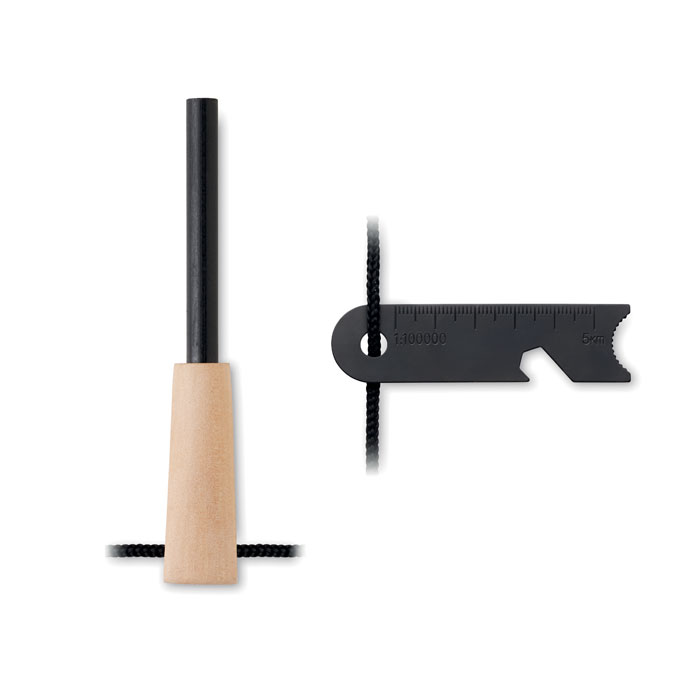 Herramientas para encender fuego en madera de pino y acero inoxidable que incluyen una varilla para encender fuego, un rascador multiusos para utilizar con el encendedor, un abridor de botellas, una regla de precisión y una llave hexagonal.
