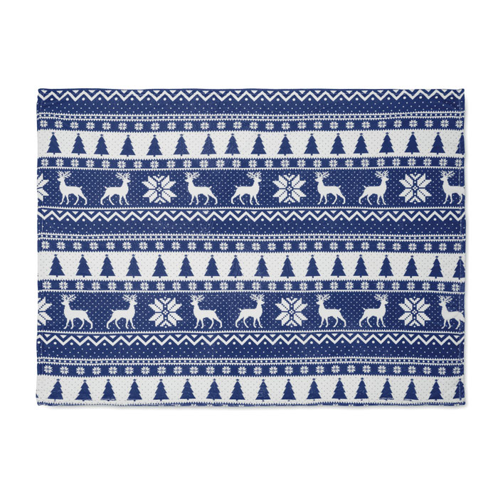 Manta polar RPET coral de 190 gr/m² con estampado invernal. Envuelta en cinta y tarjeta imprimible.